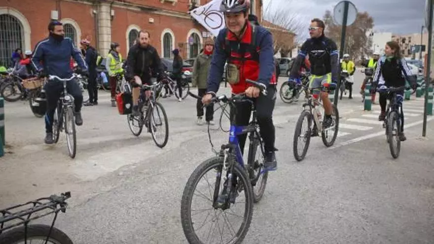 Varios ciclistas iniciando la marcha reivindicativa desde la estación del tren de Alcoy. / juani ruz