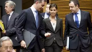 La diputada del grupo parlamentario popular Elisa Díaz González, hija del también diputado autonómico del PP y ex alcalde de Alicante, Luis Díaz Alperi, a su llegada al pleno de Les Corts Valencianes acompañada por el portavoz de su grupo, Ricardo Costa (2i), y el diputado David Serra (d). Abajo a la izquierda, hablando por teléfono, se puede ver a su padre. / EFE/Kai F rsterling.