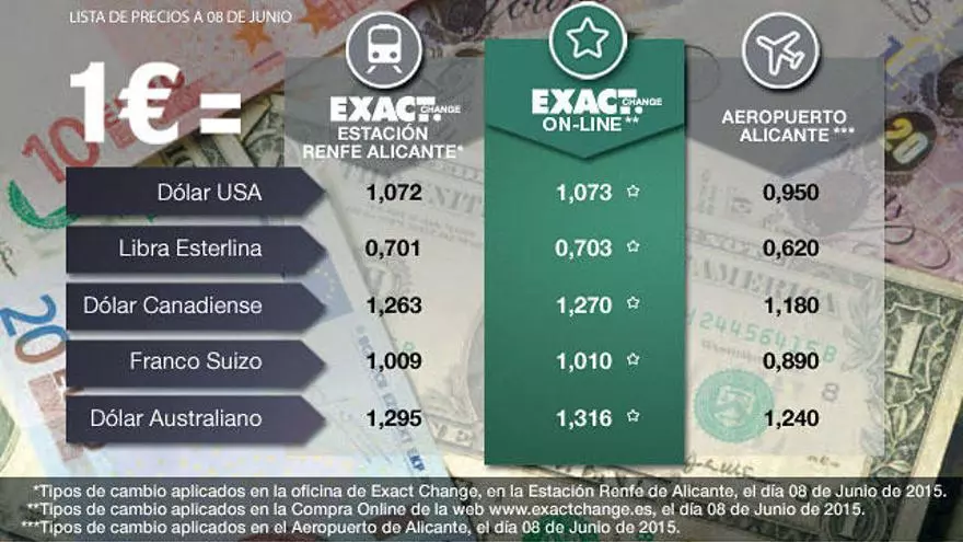 Pues hay de todo. Mucha gente va a las oficinas. Y en ellas también encuentra innumerables ventajas. Mejores precios que la banca tradicional y que en aeropuertos. Monedas que no encuentras en otros sitios€ Y una ubicación que lo facilita todo. Por ejemplo, nuestra oficina de la estación de tren de Alicante está en el mismo centro de la ciudad, lo que hace que a los clientes no les suponga ningún esfuerzo conseguir la moneda que necesitan.