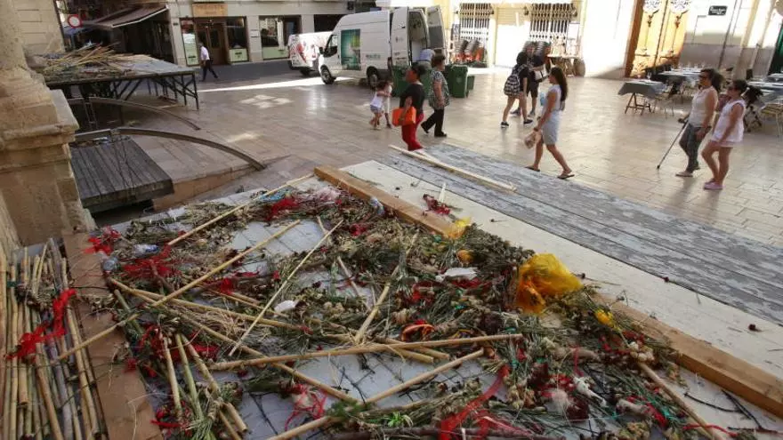 Concluida la Fiesta, los alicantinos y turistas pueden observar a día de hoy las flores secas y decenas de cañas que portaron los festeros durante la Ofrenda, junto a los dos escenarios.