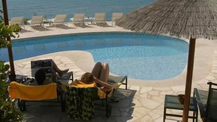 Una pareja de turistas descansa en la piscina exterior del hotel Montiboli de Villajoyosa, decano de los hoteles de lujo, en una imagen de archivo. / isabel ramÓN