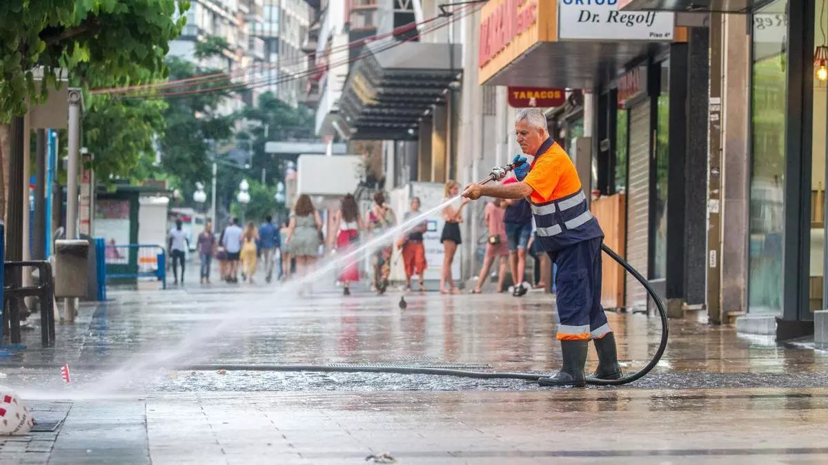 Un operario de la limpieza baldea la Rambla, en una imagen de archivo / Lars ter Meulen