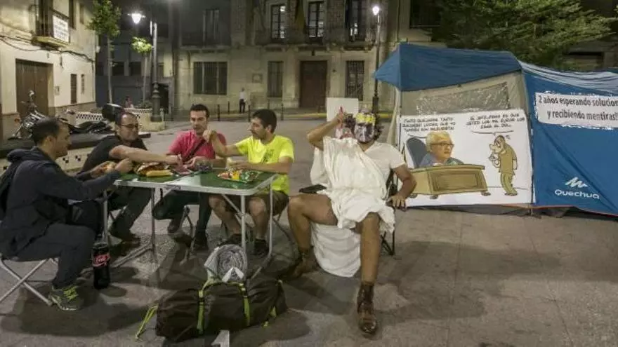 Agentes de la Policía Local de Crevillent se plantaron ayer frente al Ayuntamiento para protestar por «el inmovilismo del Consistorio» a la hora de negociar y de ofrecer nuevos servicios y condiciones laborales para el cuerpo de seguridad local. A través de pancartas reclamando un nuevo convenio y de protestantes caracterizados como el alcalde, César Asencio, el colectivo tenía previsto pasar la noche acampado frente al Consistorio, al que acusaron de usar palabras vacías en las reuniones de negociación. Los convocantes de la protesta de la Policía Local son los sindicatos Central Sindical Independiente y de Funcionarios (CSI-F), UGT y Sindicato de Policías y Bomberos (SPPLB) a los que se unieron otros simpatizantes. Teófilo Díaz, delegado de personal de la Policía Local en Crevillent aseguró que el punto más crítico de sus demandas vino en forma de apoyo a un compañero al que el Ayuntamiento denegó este verano un premio por prejubilación y que, finalmente, le fue concedido tras mucha presión sindical y protestas que llegaron hasta Alicante.