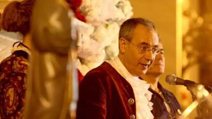 Pérez Such durante su pregón, con la patrona en primer plano. / D. REVENGA