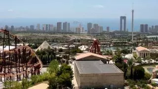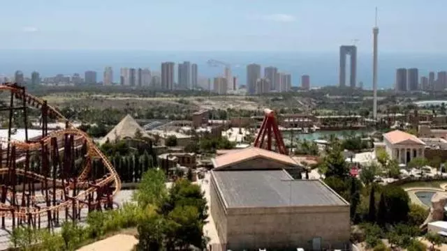 Vista aérea del parque temático Terra Mítica, con algunos rascacielos de Benidorm al fondo. / DAVID REVENGA