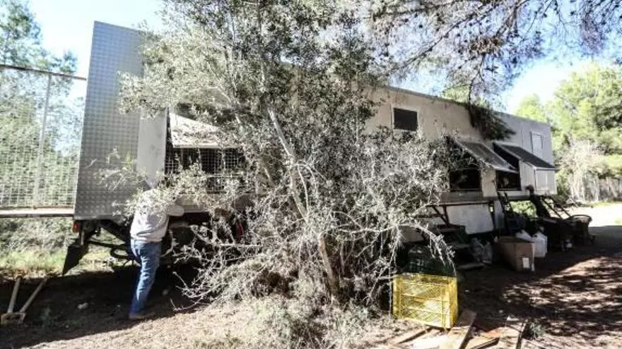 Encerrado en una jaula de menos de diez metros cuadrados, sin espacio para poderse mover, solo, sin agua corriente, expuesto a las condiciones meteorológicas y sin apenas cuidados de ningún tipo. Estas son las condiciones en las que vive un oso pardo «apresado» sobre el remolque de un camión en una finca ubicada en el término municipal de Finestrat. Tiene la mirada perdida y, cuando te cercas a contemplarlo, sus ojos sólo desprenden tristeza. Con las patas da golpes en el suelo de su particular cárcel, en la que no puede dar más que un par de pasos antes de toparse con los barrotes de hierro de la jaula en la que vive un día tras otro, desde no se sabe cuándo.