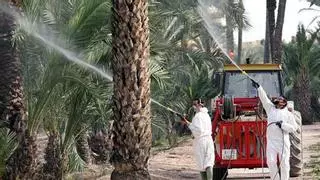 Uno de los últimos tratamientos químicos contra el picudo rojo realizado por el Ayuntamiento en el Palmeral histórico / DIEGO FOTÓGRAFOS