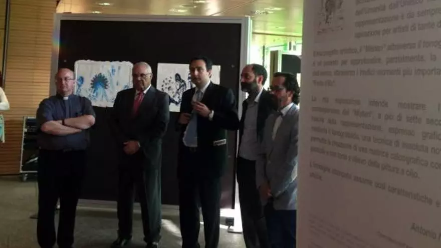La inauguración de «El Misteri d'Elx desde el tonograbado» se realizó en Milán en la tarde del jueves en el Spazio Espositivo Price Waterhouse Coopers y contó con la asistencia del artista plástico y profesor de la UMH, Antonio Navarro; el presidente de la Junta Rectora, Fernando García; el arcipreste de Santa María, Francisco Conesa; y junto a ellos, el comisario de la exposición, Valeriano Venneri y el director de la sala italiana, Valentino Guarini.