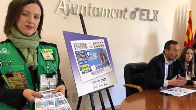 El cupón ha sido presentado por Estela Medina Peláez, directora de zona de la ONCE de Alicante, y Carlos González Serna, alcalde de Elche, acompañados por representantes de la ONCE y miembros de la corporación municipal.