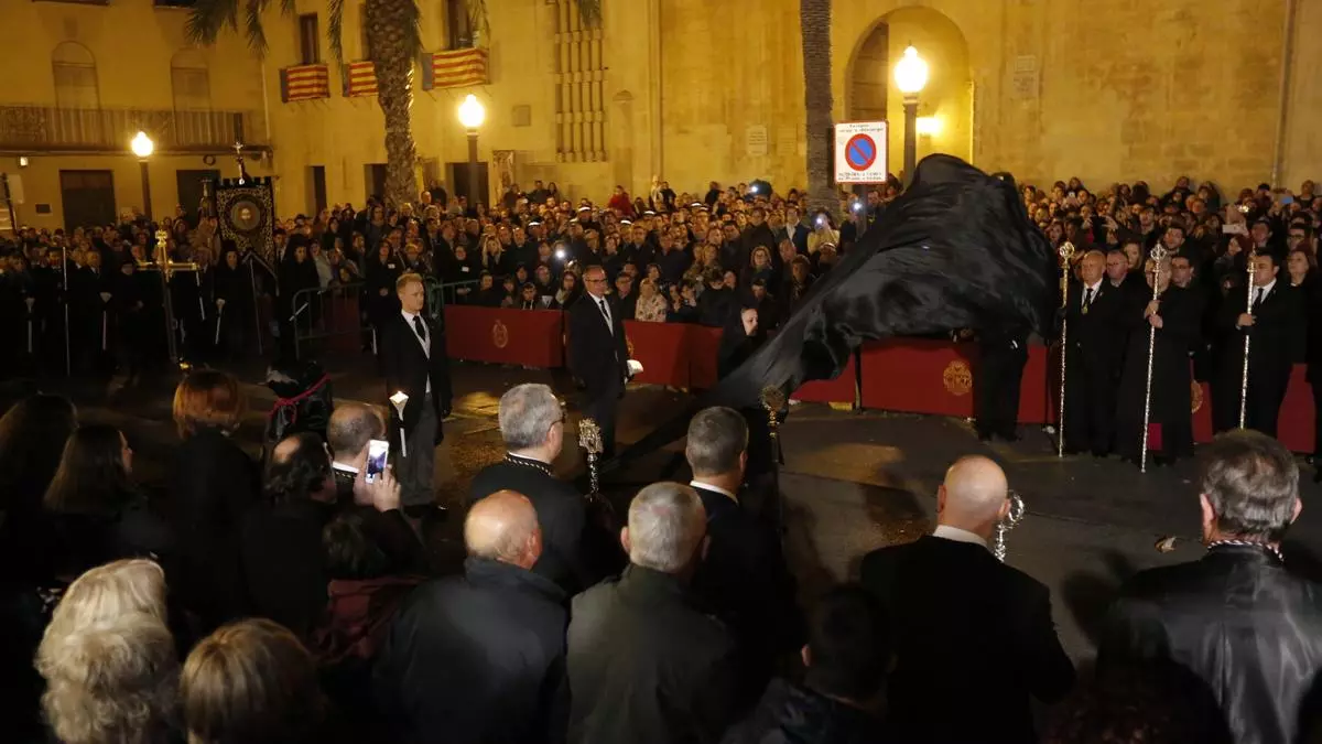 La jornada de ayer, marcada por el silencio, la devoción y el recuerdo de las víctimas de la pandemia, dejará paso este Viernes Santo a la procesión general de cofradías y hermandades y al Santo Entierro. Una vez que el Santo Sepulcro y la Virgen de los Dolores hagan acto de presencia en la nueva Plaça de Baix peatonal, algo previsto a las 23 horas, se producirá la «Trencà del Guió», que será uno de los puntos fuertes de la noche ilicitana. Este ritual, que data de finales del siglo XVI, es una de las ceremonias características de la Semana Santa de Elche. La tradición marca que si el guion se consigue romper a la primera, será un buen año para la ciudad. María Cartagena, Andrea Moltó y Silvia Agulló forman la tripleta.