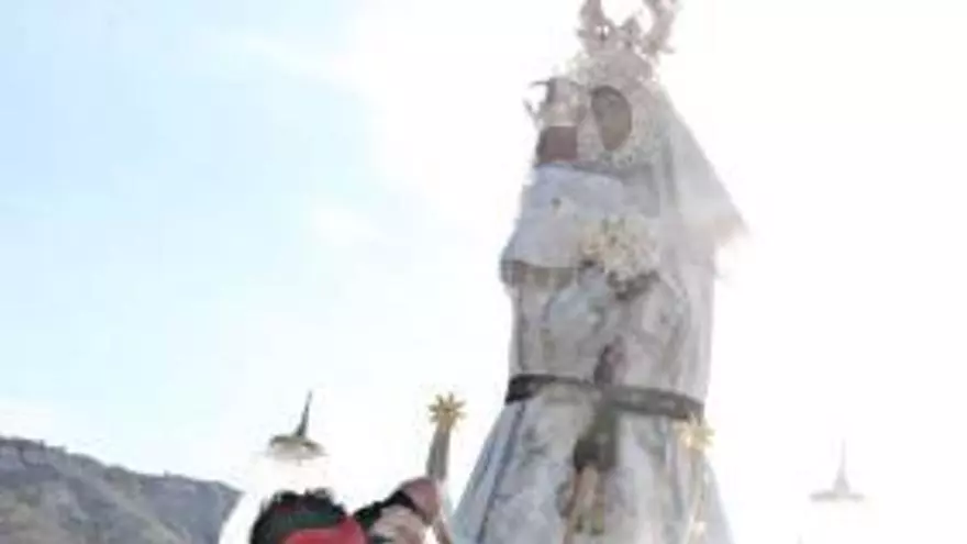 A las seis de la tarde, la patrona salía por la portalada del santuario. Era éste uno de los momentos más emocionantes de la tarde del último domingo de agosto. Los aplausos y los llantos de emoción se sucedieron en el momento en que la Virgen apareció y unas palomas sobrevolaron su corona. Mientras los miles de romeros se agolpaban en el primer tramo del camino, los arcabuceros de la comparsa de Piratas anunciaron que iniciaba el camino.