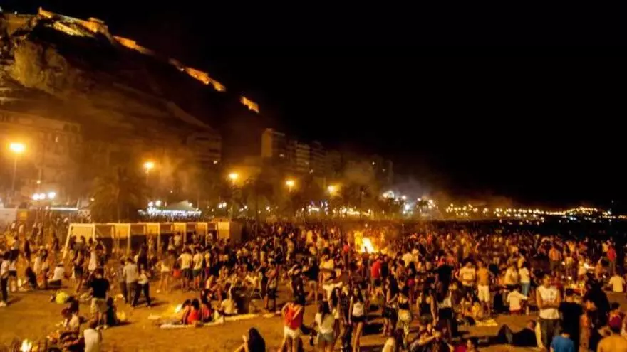 Durante estas noches cerca de 30.000 jóvenes se congregan en la playa del Postiguet, muchos de ellos para hacer botellón. / javier marco
