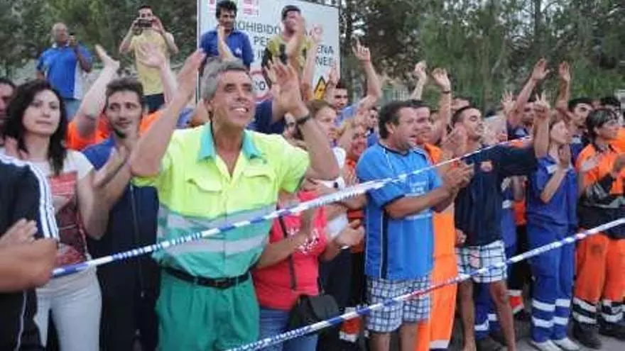 Una barrera humana formada por 50 empleados de Proambiente. Eso es lo que se encontraron los cuatro agentes de la Policía Local que ayer por la tarde acudieron al vertedero acompañados por la Guardia Civil para precintar su acceso principal en cumplimiento de un decreto de Urbanismo que establece como medida cautelar el cierre de las instalaciones que la planta de residuos tiene en Orihuela sin licencia. Los empleados se sienten "muy acosados" y dicen que lo único que intentan es "defender nuestro pan y el de nuestros hijos cuando nos hemos enterado de que venían precintar, no nos pueden impedir que vengamos a trabajar, lo demás está donde tenga que estar, que es en sede judicial" (en referencia a los supuestos vertidos ilegales en suelo no autorizado dentro de la empresa y en fincas agrícolas fuera de ella, aunque añadió que "en seis años que llevo trabajando no he visto nada ilegal y ahora tampoco, se está llevando la basura a otros vertederos"). Pasadas las 21.15 horas los agentes lograron pasar una cinta que significa el cierre y clausurar los equipos de pesaje de camiones, que son el "motor" de la planta.