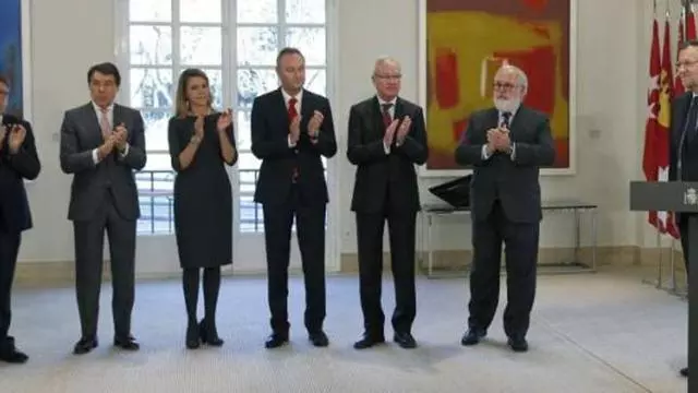 Los presidentes de Extremadura, Madrid, Murcia, Comunidad Valenciana y Castilla-La Mancha aplauden a Rajoy ayer. / javier lizÓN/ efe