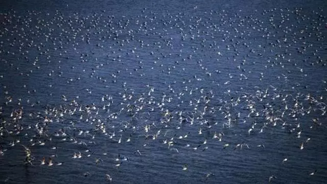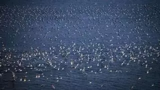 Cientos de gaviotas levantan el vuelo al sentirse amenazadas en el embalse de La Pedrera. / TONY SEVILLA